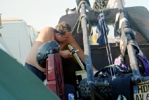 ![]() Duschen dringend erforderlich. 30°C im Schatten und 6 Stunden auf dem Moped. Hier haben wir uns aus einem Parkverbotsschild einen Halter für unsere Solardusche gebaut (ACHTUNG: Die durchsichtige Seite des Sackes zur Sonne gewandt aufhängen.)