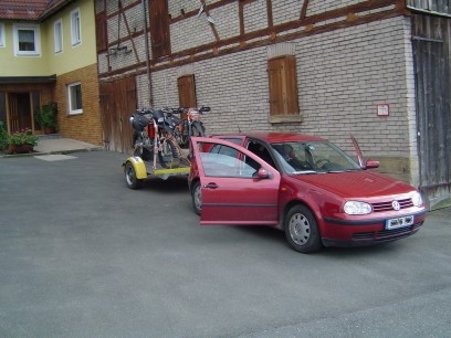 ![]() Bei Michl im Hof - aufladen. Nochmal ein Moped und dazu 100 kg Gepäck. Der 75PS-Golf hat ordentlich was zu tun. Jetzt ist es so um die 18:00 Uhr |