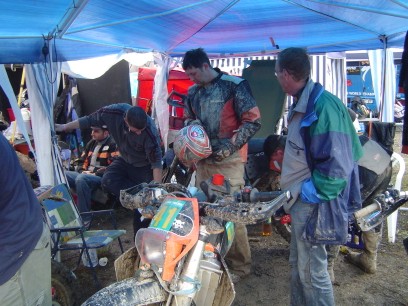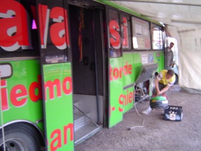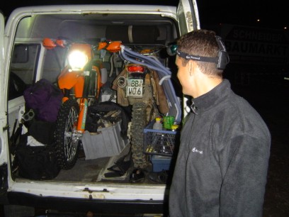 Und das ist er: der Team-Bus. Das Casicool-Rekluse-Team bestand aus: 4 Fahrer und 3 Mechanics. Alle schlafen im Bus, nix da pennen im Zelt wie die Viecher. Da wo früher das Gepäck der Fahrgäste drin war, lagert jetzt das Bier. Bier, das so viel ist, das wir es gar nicht trinken konnten - wie im Paradies. Alles organisiert von Huski... |