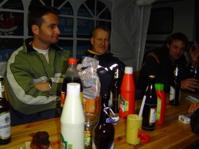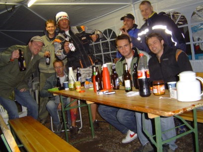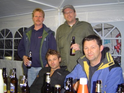 Die 4 Fahrer vom Casicool-Rekluse-Team: links stehend Teamcheffe Huski, sitzend Michl, daneben Christl und wieder sitzend Blackchen. Nachdem so ein Rennen sehr anstrengend ist, sollte man am Vortag schon mit dem Trinken beginnen. |
