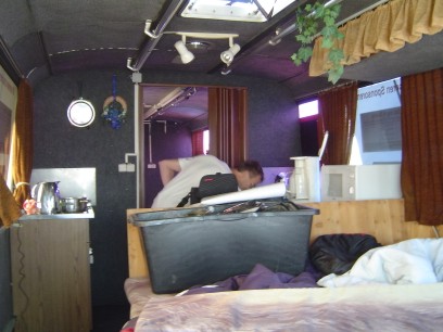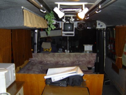 Im Teambus: vorne Sitzgruppe mit Fernseher, Stereo, usw. |