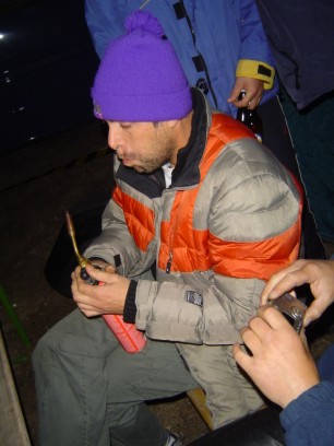 ![]() Zu vorgerückter Stunde werden die Männer vom Wombat-Racing-Team experimentierfreudig. Sie füllen die Lungen mit Propangas und schleudern Feuerbälle in die Luft. Der hier ist ein gutes Beispiel für unsere Kinder - er ist Lehrer. |