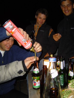 ![]() Die Stimmung sinkt mit jeder Nachtrunde. Huski trinkt Limo aus der Bierflasche... |