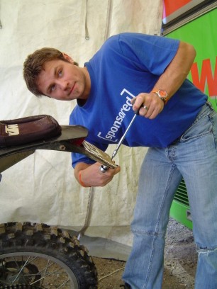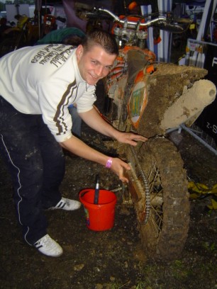 ![]() Markus (Sohn von Huski) ist Mechanic. Er muss grade nicht simsen und putzt Papas Kette. Und schon bimmelts wieder in der Hosentasche.. |
