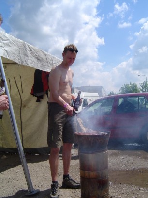 Der Typ am Boden hätte sich beinahe ins Schwedenfeuer gesetzt (siehe Qualm links). Aufgrund mangelnder Koordination (Vollrausch) natürlich. Natürlich vom BMW-Team. |