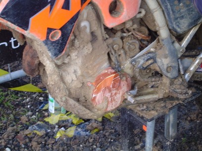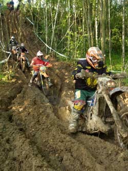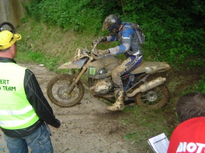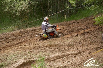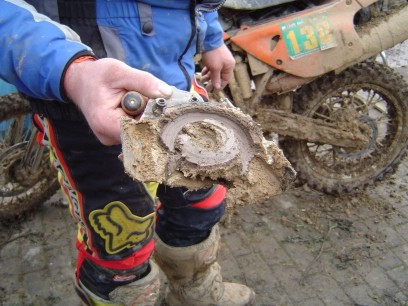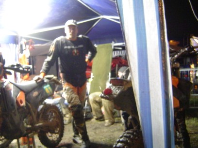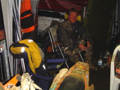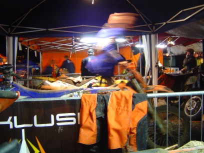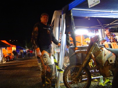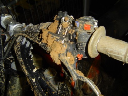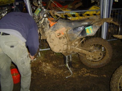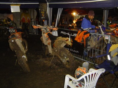 In der Nacht entpuppt sich eine Abfahrt zum Schreckgespenst. Diese Abfahrt ist derart aufgefahren, dass ein langsames Runterfahren nicht mehr möglich ist, es reißt einen einfach den Lenker aus der Hand. Bremst man, folgt sofort der Überschlag nach vorne. Viele Fahrer weigern sich die Abfahrt runterzufahren. Die die Runterfahren lassen den Hobel einfach laufen und hoffen nach 150m STeilabfahrt die (richtige) Spurrille zu treffen. Ich verzichte darauf und nehme die obere Variante. Während meiner Bergungsaktion habe ich 3 Blicklichter im Schlamm vergraben gefunden... |