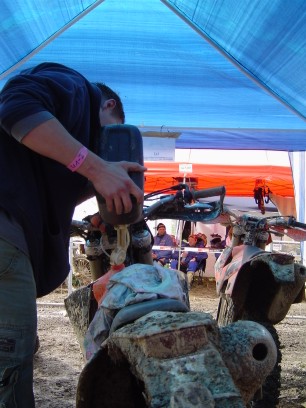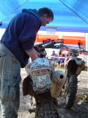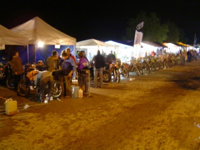 ![]() Zwischendurch müssen die Fahrer mit ihren Maschinen zur Technischen Abnahme. Kontrolliert werden die Blinklichter (aus dem Fahrradzubehör) von denen jeder 2 Stück dran haben muss. Eins am Moped und eins am Rücken. Die müssen eingeschaltet werden, sobald es dunkel wird. Ohne Blinklichter kein Start. |