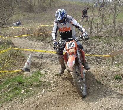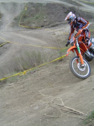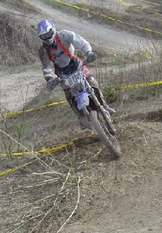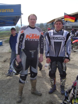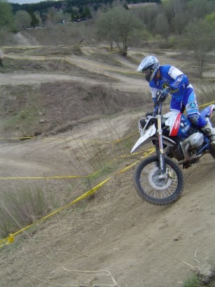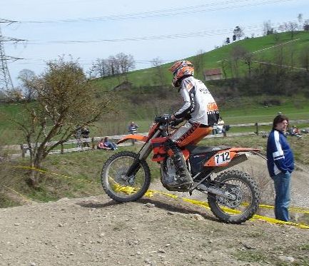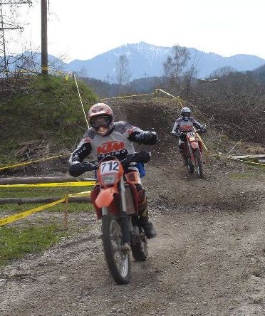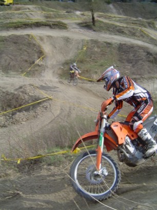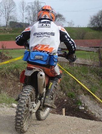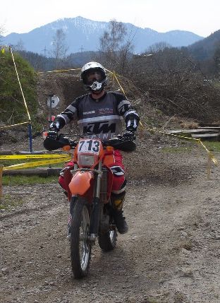 Erlösung in der vorvorletzten Runde. Das Enduro-Weltbild ist wieder zurechtgerückt. Pfeiffer ist schon lange weg. Kirssi hat wieder den Start verloren. Vor ihm drei mit richtigen Motorrädern (KTM EXC 525: "best bike on earth" - seht meine anderen Berichte"). Sie haben gelauert, bis sich der Finne mit der aufgeblasenen Gummikuh schlappgefahren hat und dann zugeschlagen - mit halber PS-Zahl. |