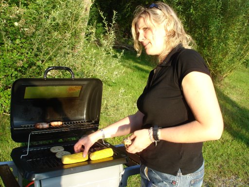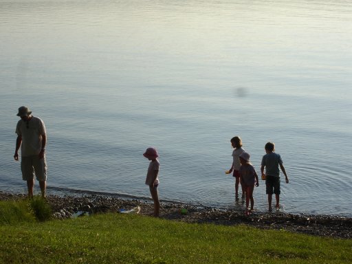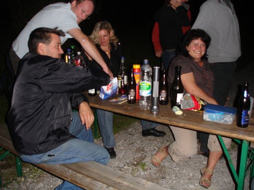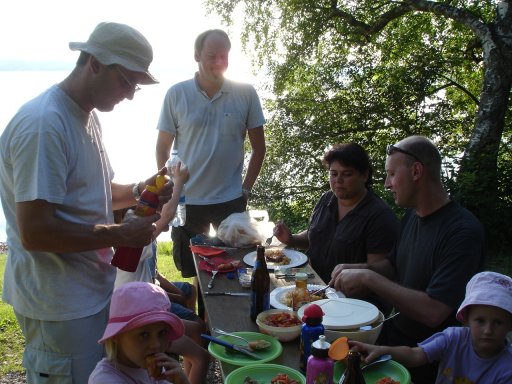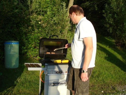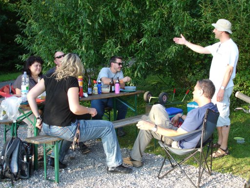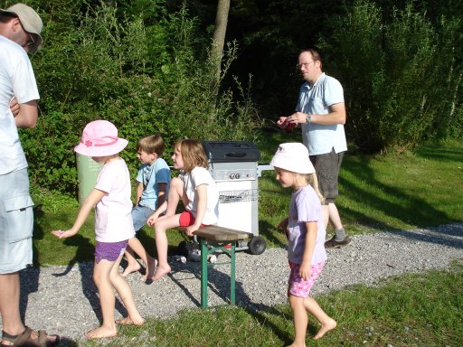 Endlich Super Wetter: wir grillen am See! Christl stellt Grill und Lavagestein, Jan karrt meine Bierbänke ans Ufer. So kanns losgehen.