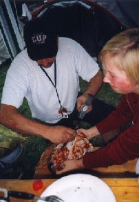 ![]() Am Abend: Grillen mit Hindernis: Eindeutig zu spät aufgetaut. Dann einfach den beschuldigen der es eingefroren hat. So einfach geht das. KDW mit Schlitzmeißel und 500gr Hammer beim Zerteilen des 10kg Monofleischblocks. Gut das Nathalie Metzgerin von Beruf ist. |