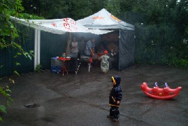 Es kübelt wie aus Eimen. Ein Segel schützt den Grill vorm Absaufen.