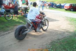 Hier eine Hillclimbing Maschine mit Riesenstacheln im Hinterreifen. Zur Gaudi sind damit die Typen rumgekurvt und gleich aufs Maul geflogen (harharhar). So ein Schwachsinn...