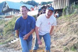 ![]() Reifenwechselwettbewerb. Christl wechselt in 2 Minuten 4 Sekunden (einmal den Reifen runter und wieder rauf). Bestwert waren 56 Sekunden. Die schlechtesten wären bis jetzt noch nicht fertig, hätte man ihnen nicht geholfen... |
