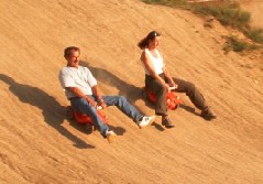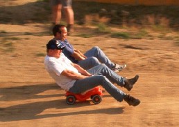 Wettbewerb Nr. 2: Bobby-Car-Race. Vom Hügel hinab muss man ca. 30m weit rollen. Die Zeit wird gestoppt. Es kommt der am weitesten, der sich am besten abstösst und am ruhigsten aufm Bobby bleibt.