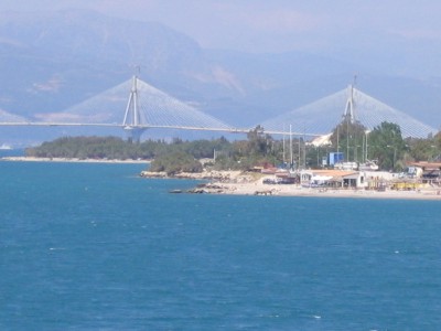 ![]() Mit der Fähre von Ancona (I) nach Patras (GR). Im Bild die neue Brücke vom Peloponnes aufs Festland. Soll zu den Olympischen Spielen (August 2004) fertig werden. Jetzt ist es der 29.Mai 2004, Probebetrieb... |