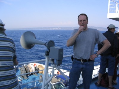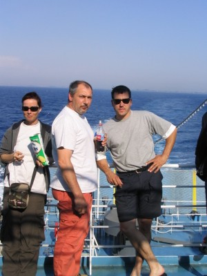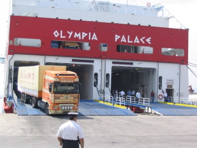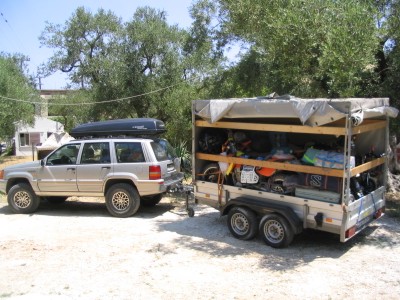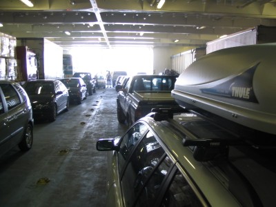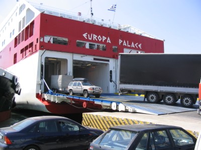 ![]() Mit "Minoan Lines" 20 Stunden auf der Fähre. Ankunft in Patras. KDW im Jeep verläßt gerade das Campingdeck. Im Anhänger 4 Mopeds und jede Menge anderer Wohlstandskram. |
