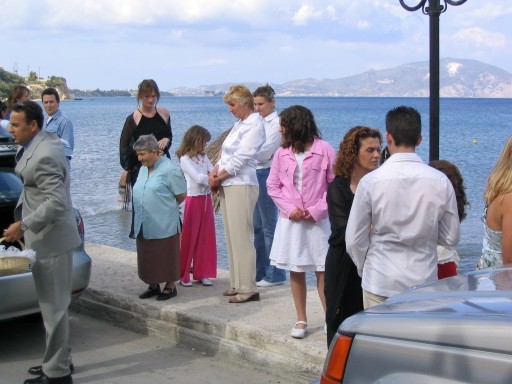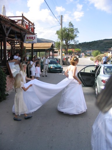![]() Pünktlich um sieben kommt die Braut. Ab gehts von Keri am Meer nach Keri aufm Berg (8km) in die Kirche. |