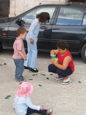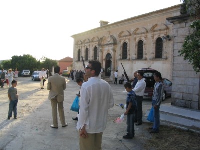![]() Vor der Kirche wird schon lange geballert. Die Kids sammeln die Patronenhülsen auf. Schwabbel (im roten Shirt) hat die meisten. |