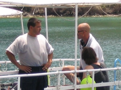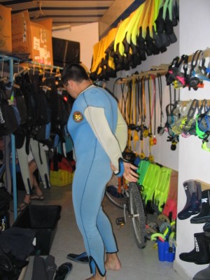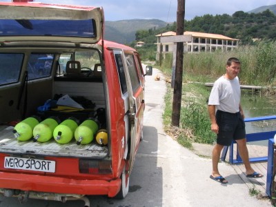 ![]() Tom hat Geburtstag und bekommt von uns eine Tauchstunde geschenkt. Mit dem Albi-Mobil (links) gehts nach der Einkleidung zum Schiff. |