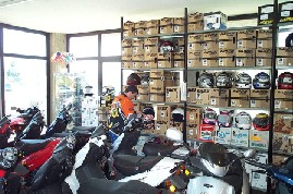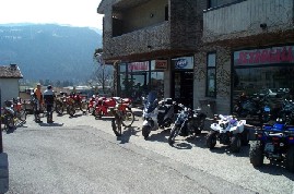 Italienischer Mopedtandler. Vor dem Laden stehen japanische Koppermotorräder, igittigitt.