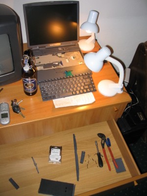 ![]() Super-GAU: Ganz von selber ist eine volle (geöffnete) Bierflasche auf das Laptop gefallen. Das ganze Gerät ist abgesoffen. Schnell zerlegt und unter der Dusche abgespült. Nach einem Tag war der "Rausch" vorbei - funktioniert wieder astrein (und ist auch nicht abhängig geworden). |