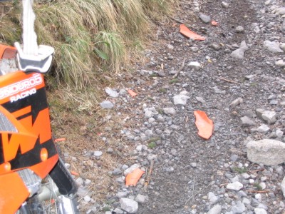![]() Das ist nicht von uns. Die Schneeschmelze schwemmt so einiges an: Kotflügel und Seitendeckel einer KTM. Gerippe haben wir keine gefunden. |