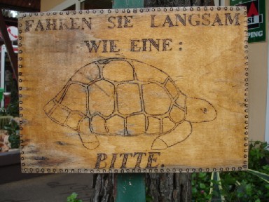 "Fahren Sie langsam wie eine Schildkröte Pitte". Zum Glück steht nicht da: "Fahren Sie leise wie eine Hausstaubmilbe". Am kommenden Wochenende hebt sich der der Geräuschpegel rund um den Campingplatz um 50 dbA (Tag und Nacht !!!).