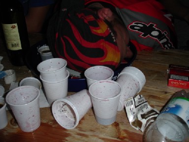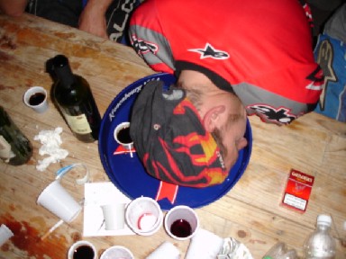 Nach der Pistonata am Campingplatz. Es gibt ordentlich was zu feiern. Den Präsi vom 1.FC Randersacker hats erwischt: Voltrunken liegt die Birne im Tablett: Ist das nicht peinlich??
